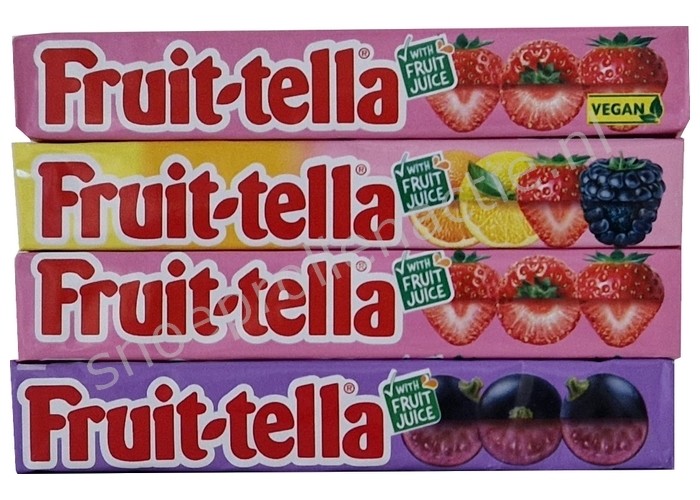 Fruit-tella Favorite (4 mix rollen) een rol Summerfruit (aardbei, citroen, braam en sinaasappel), een rol strawberry (aardbei), en een rol Blackcurrant ( zwarte bessen)